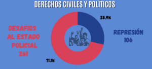– Los 261 Desafíos al Estado policial (lo bastante audaces como para motivar represalias) representaron el 71.11 % de las 367 protestas o denuncias vinculadas a Derechos Civiles y Políticos (DCP), mientras que las 106 entradas del registro motivadas por actos represivos equivalen al 28.89 % restante.