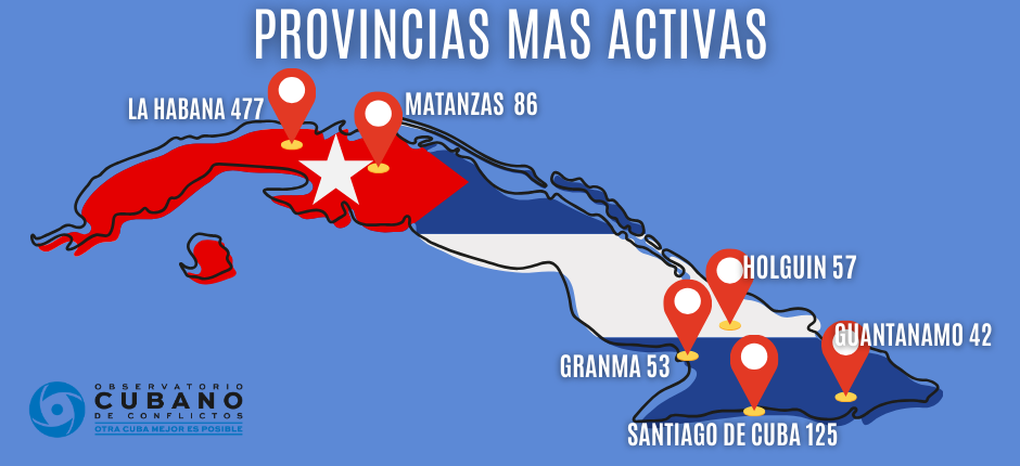– El territorio más activo fue La Habana con 477 protestas y denuncias. Le siguieron por este orden Santiago de Cuba (125), Matanzas (86), Camagüey (78) Holguín (57), Granma (53) y Guantánamo (42).