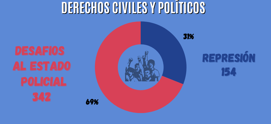 – Los 342 Desafíos al Estado policial (lo bastante audaces como para motivar represalias) representaron el 68.95.% de las 496 protestas o denuncias vinculadas a Derechos Civiles y Políticos (DCP), mientras que las 154 entradas del registro motivadas por actos represivos equivalen al 31.05 % restante.