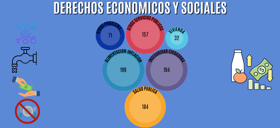 – Las 837 protestas o denuncias relacionadas con DES fueron encabezadas en diciembre por la categoría Alimentación, Inflación, Agricultura (199). Luego se ubicaron las vinculadas a Inseguridad Ciudadana (194) Salud Pública (184) Servicios Públicos (157); Otros Problemas Sociales (71) y Vivienda (32).