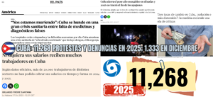 INFORME DE PROTESTAS, DENUNCIAS Y ACCIONES CÍVICAS EN CUBA DICIEMBRE 2025 Cuba: 11.268 protestas y denuncias en 2025; 1.333 en diciembre El Observatorio Cubano de Conflictos (OCC) registró un total de 11.268 protestas, denuncias y declaraciones críticas del régimen en la isla a lo largo de 2025, lo que representa un aumento de poco más … Continue reading Cuba: 11.268 protestas y denuncias en 2025; 1.333 en diciembre