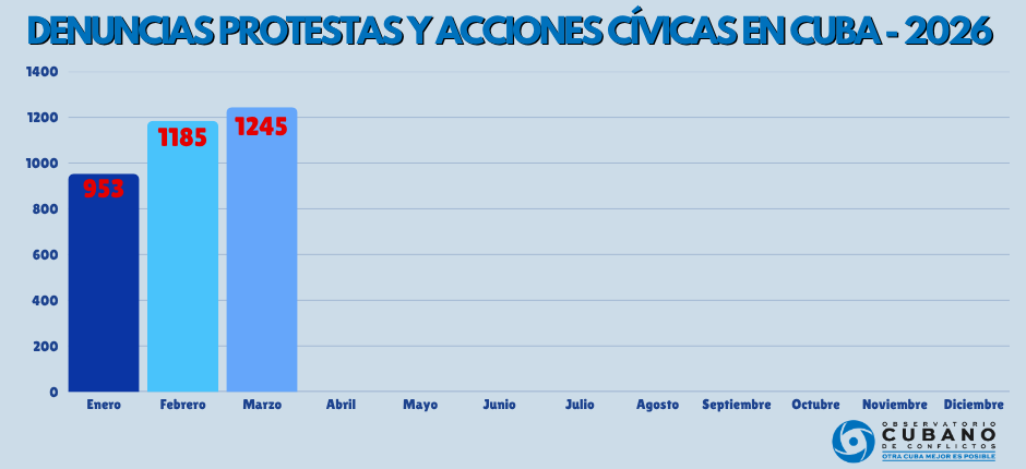-El Observatorio Cubano de Conflictos (OCC) registró 1.245 protestas o denuncias espontáneas en marzo de 2026, un 4,8 % más que las 1.185 de febrero y cerca de 80 % más que las registradas en el mismo mes del 2025.