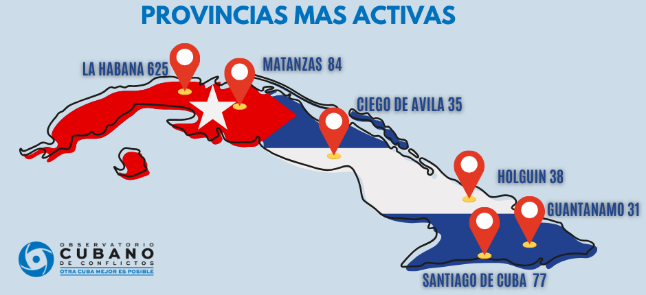 – El territorio más activo fue La Habana con 625 protestas y denuncias. Le siguieron por este orden Matanzas (84); Santiago de Cuba (77); Holguín (38); Ciego de Avila (35); y Guantánamo (31).