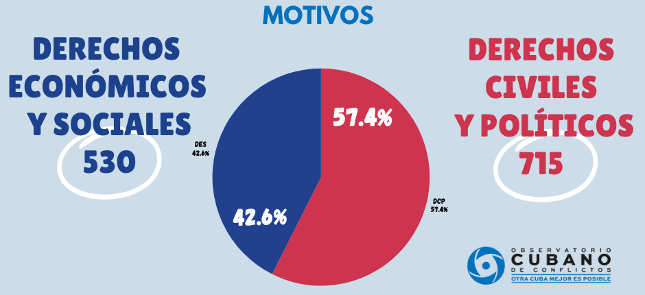 Considerando lo anterior, el Observatorio Cubano de Conflictos ha identificado ocho líneas principales de conflicto entre la mayor parte de la población y el Estado totalitario. Unas se relacionan con Derechos Civiles y Políticos (Actos represivos y Desafíos al Estado policial) y otras con Derechos Económicos y Sociales (Inseguridad ciudadana; Otros problemas sociales; Servicios públicos; Vivienda; Alimentación, inflación agricultura; y Salud pública).