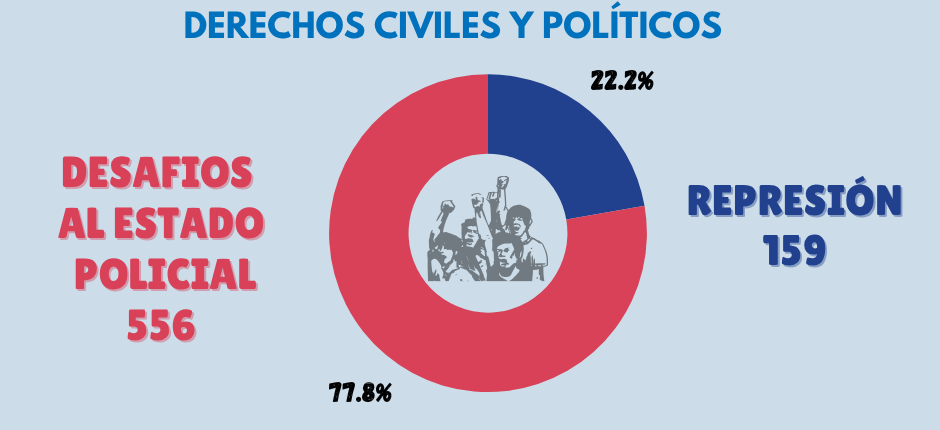 – Las 715 protestas o denuncias relacionadas con Derechos Civiles y Políticos (DCP) incluyeron 556 Desafíos al Estado policial (acciones lo bastante audaces como para motivar represalias) y representaron 57.4% del total mensual de 1.245. Los Desafíos incluyeron 54 protestas presenciales y 70 carteles antigubernamentales. Las otras 159 DCP correspondieron a Actos Represivos.