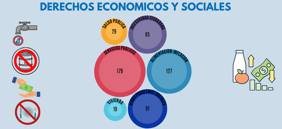 Las 530 protestas o denuncias relacionadas con Derechos Económicos y Sociales (DES, 42.6%) fueron encabezadas en marzo por la categoría de Servicios Públicos (179). Luego se ubicaron las relacionadas con Alimentación, Inflación, Agricultura (127); Otros Problemas Sociales (91); Inseguridad Ciudadana (85); Salud Pública (29) y Vivienda (19).